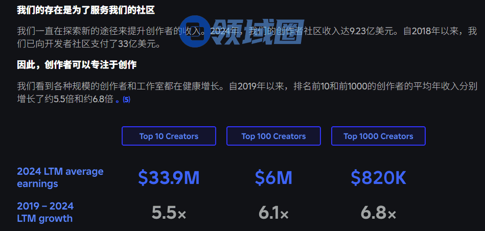比如据Roblox最新透露,平台上Top 10开发者的平均收入在去年达到了3390万美元(约合2.4亿人民币),仅在2024年,Roblox就向平台开发者支付了高达9.2亿美元的分成(约合66亿人民币)。起步相对更晚的Epic Games则宣布拿出《堡垒之夜》高达四成的净收入,投入对UEFN生态开发者的分成,顶级开发者的年收入预估也能达到千万美元级。
