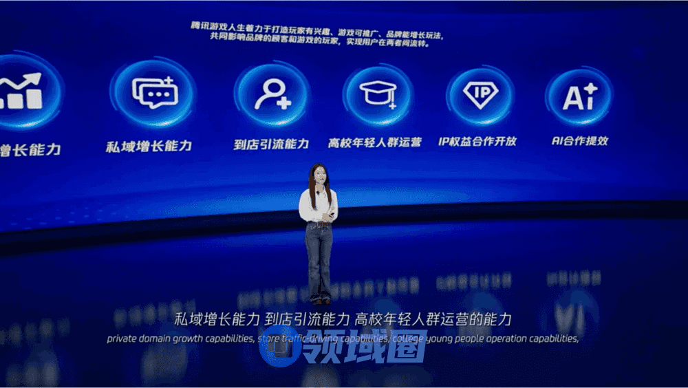 腾讯游戏人生商户平台产品负责人杨娴则展示了平台在商户营销增长能力、私域增长能力、到店引流能力、高校年轻人群运营、IP权益合作开放、AI合作提效六大核心能力上的突破。例如,开放品牌账号体系对接、创新推出“社群券”及“新皮肤英雄试玩卡”等产品,为合作伙伴实现可持续经营增长提供全方位支撑。
