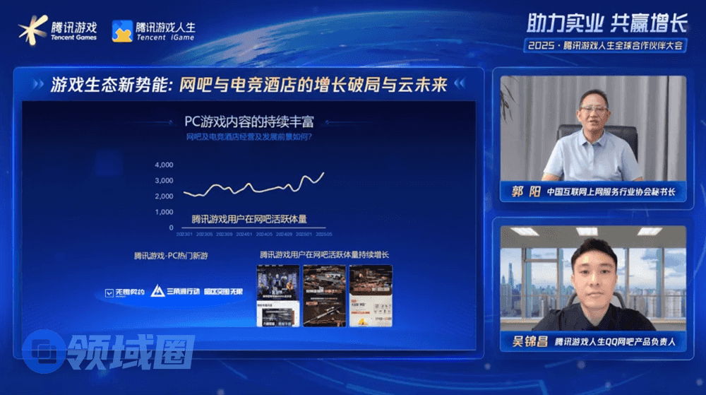 中国互联网上网服务行业协会秘书长郭阳与腾讯游戏人生QQ网吧产品负责人吴锦昌连线时提到:PC游戏内容提升用户粘性,云服务“轻终端强算力”模式降低硬件门槛,二者结合推动网吧转型为集沉浸体验、云端服务和精准流量于一体的数字服务体,创造行业新增量。
