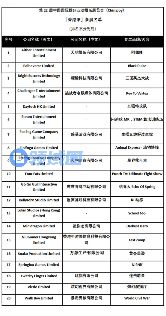 是次参展的20间企业均为本地潜力十足的游戏公司,不少参展企业也曾大获国际好评,「跳指有限公司」、「Four Fats Limited」等曾开发出达千万级下载量的游戏作品,「天明娱乐有限公司」的参展游戏「阿佩隆」甚至已取得逾亿元融资。所有企业将以最新代表作参展,充分展现香港游戏产业的创意实力与国际潜力,参展企业将于现场设游戏试玩环节,让一众参观者在亲身体验的时间内直观感受游戏的吸引力与潜力。
