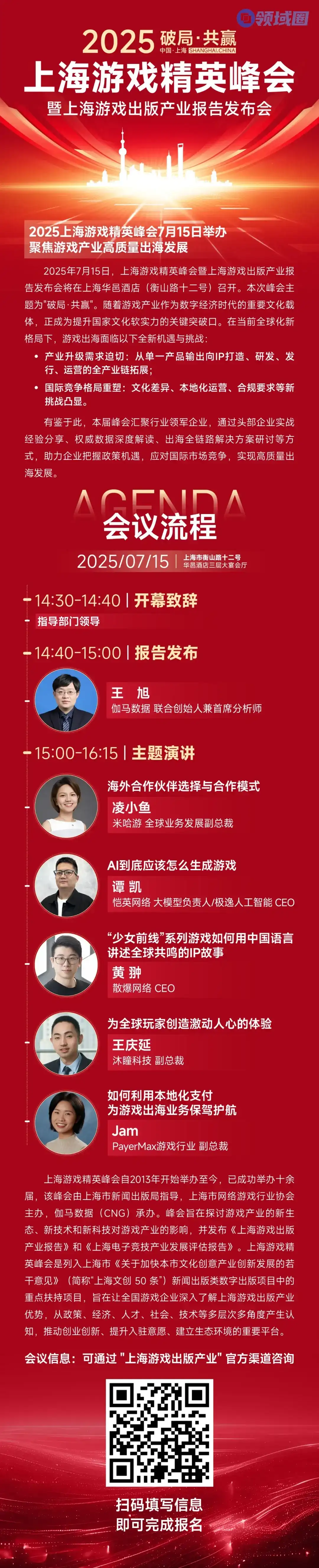 本届峰会将以“破局·共赢”为主题展开探讨全球游戏出海。游戏产业作为数字经济时代的重要文化载体,正成为提升国家文化软实力的关键突破口。本届峰会将重点讨论在当前全球化新格局下,游戏产业面临的全新机遇与挑战,围绕政策机遇、产业链协同、国际竞争格局等内容进行讨论。