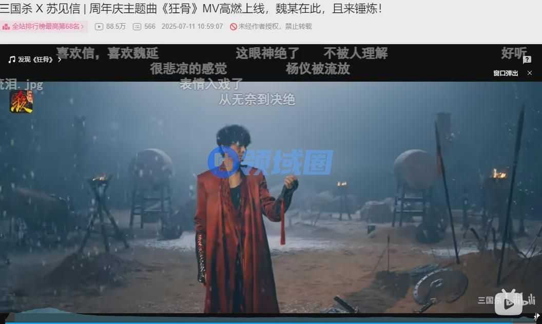 主题曲的MV更是制作精良。开篇,苏见信高亢的声音和激烈大气的台词如火焰般瞬间点燃情绪。随着音乐推进,歌词变成独白形式,歌手仿佛化身为魏延,将心绪娓娓道来。而在最后的高潮部分,通过音乐和台词的反复、递进,进一步放大了情感张力,将主题升华到极致。通过苏见信的精彩演绎,魏延那不被世人理解却依然坚持自我、忠于信念的狂傲与执着,借助音乐和MV的情绪渲染,深深触动了玩家。