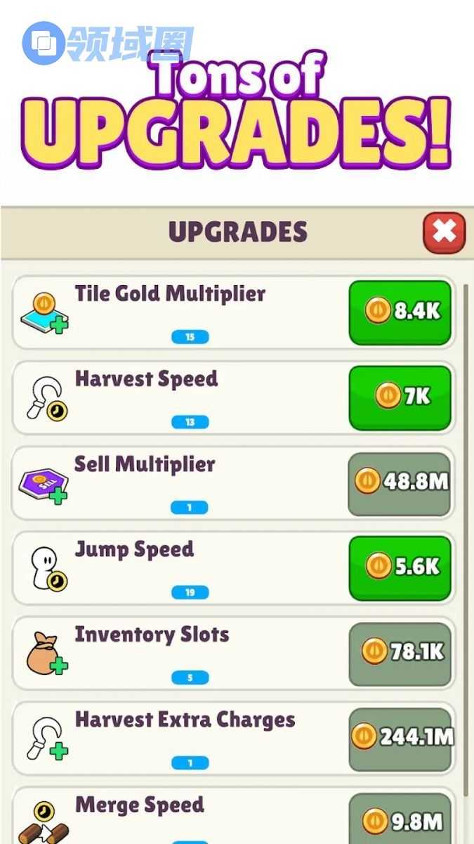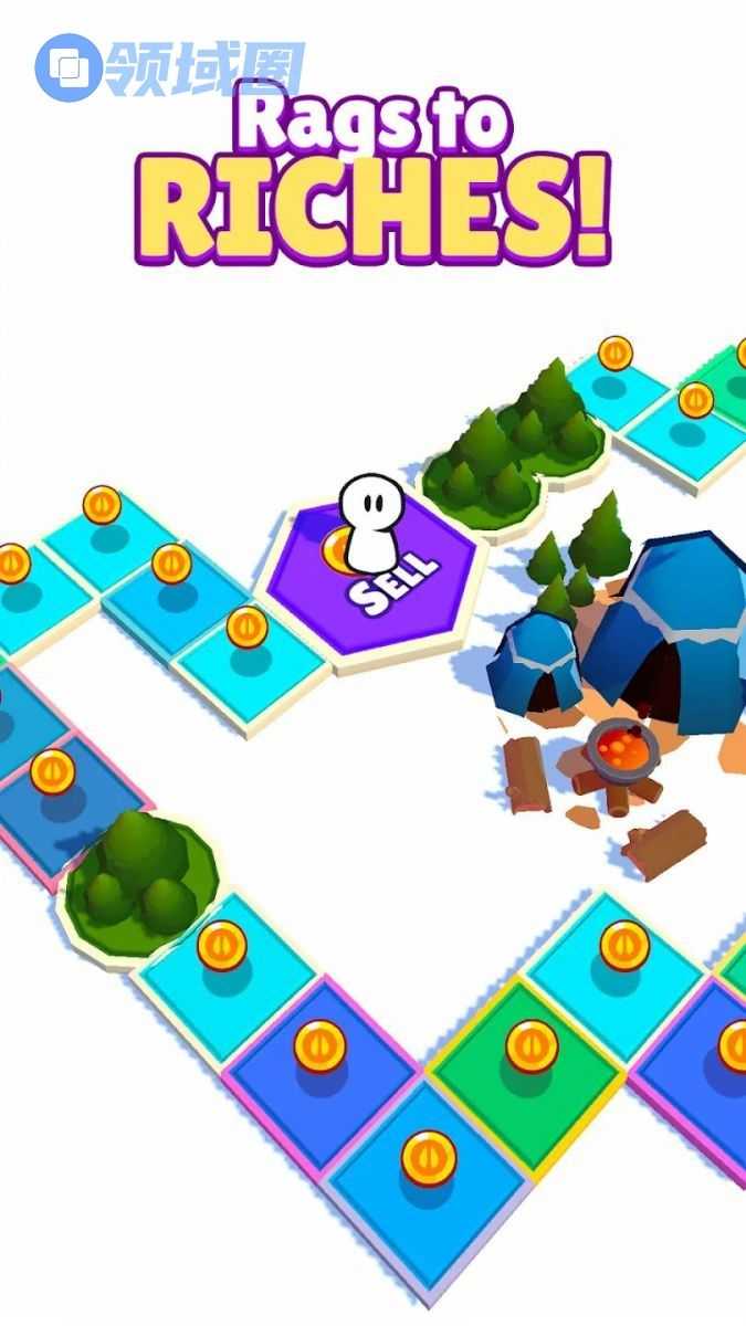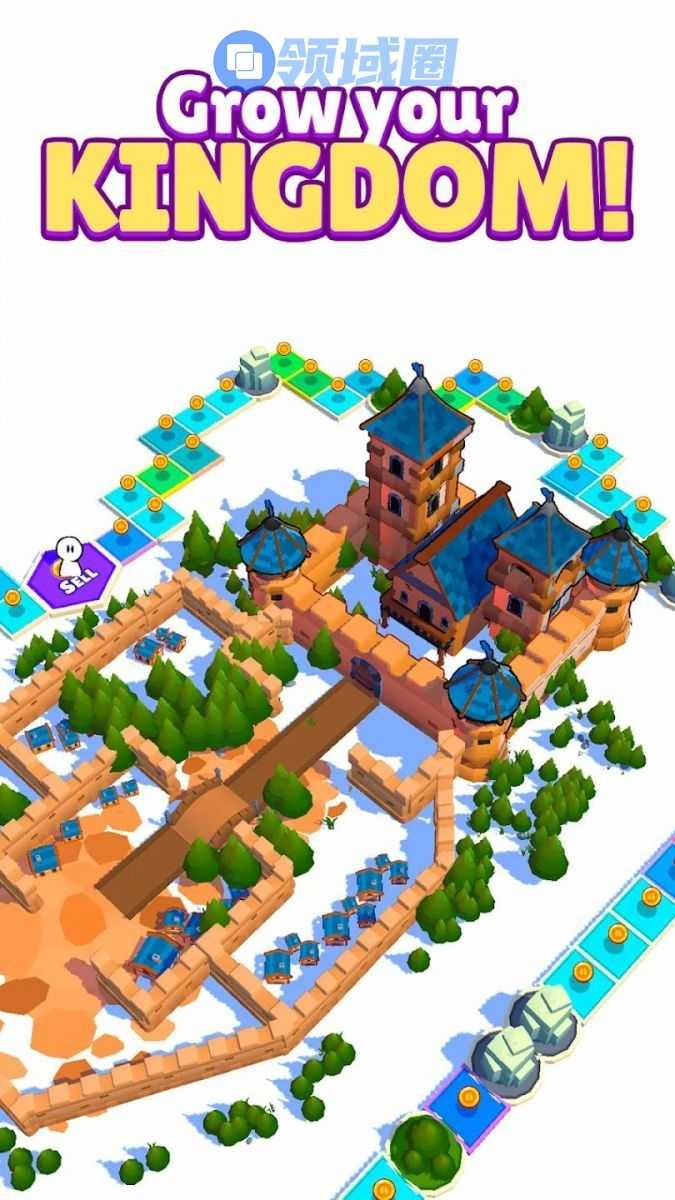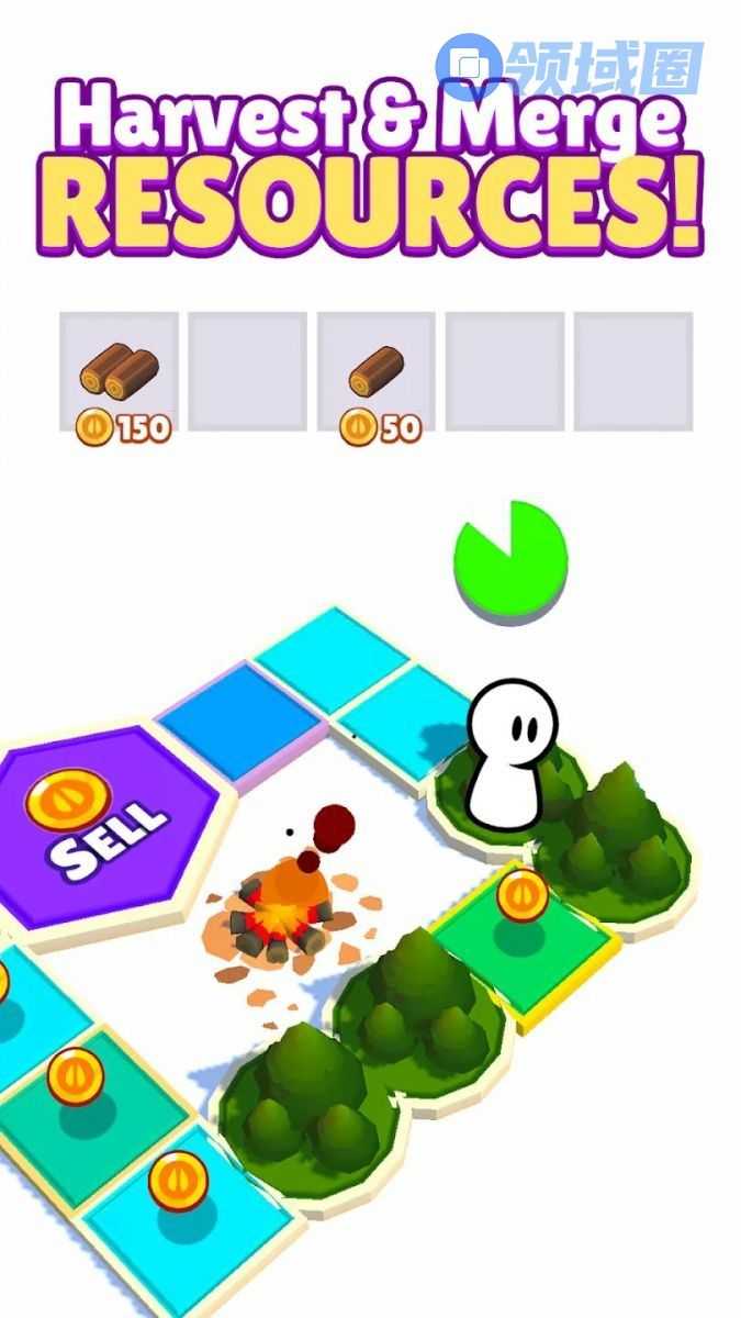 介绍:玩家控制小人按住GO,在棋盘上绕圈拿金币,在对应的资源区停留放置,可以采集资源,并且通过二合merge形式合成更多数量的资源。并用资源进行各种数值提升,强化自己,开拓新的地图。