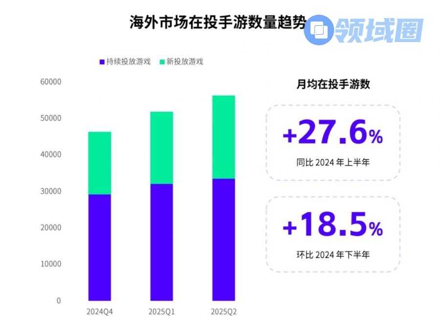上半年海外月均在投手游数同比增长 27.6%;新投放游戏表现尤为活跃,第二季度超 2.2w 款手游为首次投放,反映出游戏厂商面对广告市场仍保持积极的投放态度。