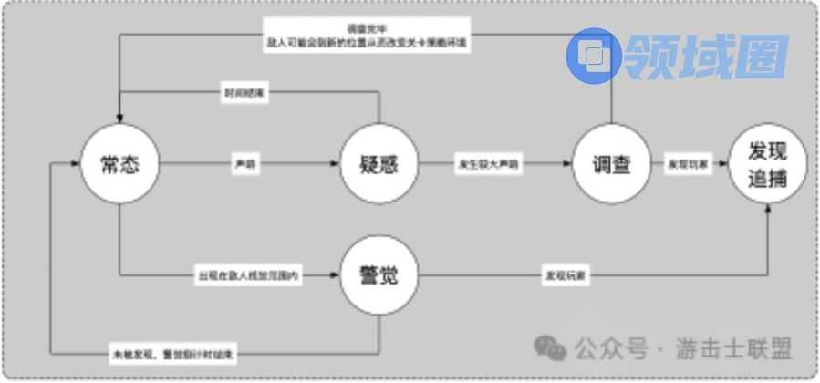 不同游戏对于分层感知状态行为的设计是不一样的,例如可以设置多个玩家发现阶段,警觉状态敌人不会移动,若达到一定阈值则会进行巡逻;还有一些游戏允许猫捉老鼠的情况,在发现后玩家可以进行逃跑或者击杀。这里设计者需要从期望的玩家体验出发来进行设计。