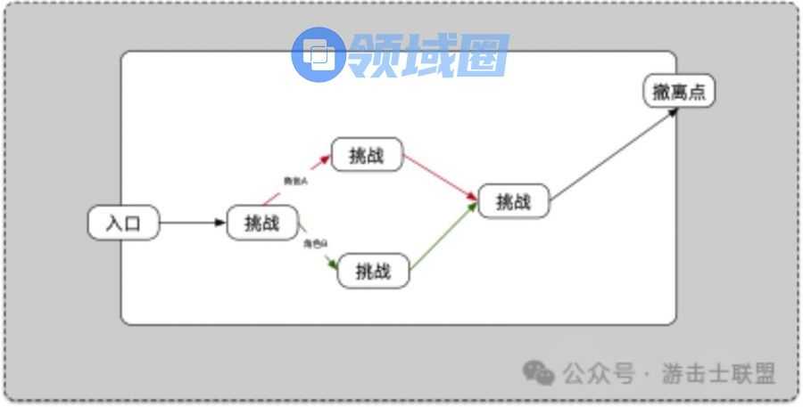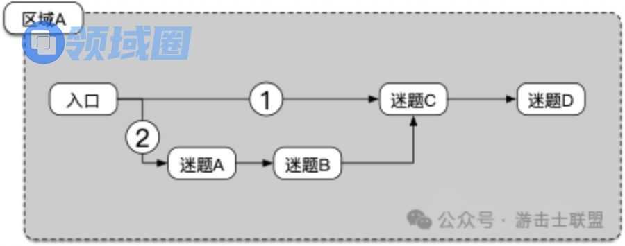 - 小范围迷题:完成区域的挑战,属于一个中快感循环,小范围迷题往往需要设计者进行一些设计关联,例如一个关卡分成了AB两个区域的挑战,玩家在完成A区域挑战后的结果应当对B区域有作用,否则就会造成快感割裂(后面会提到一个例子)。
