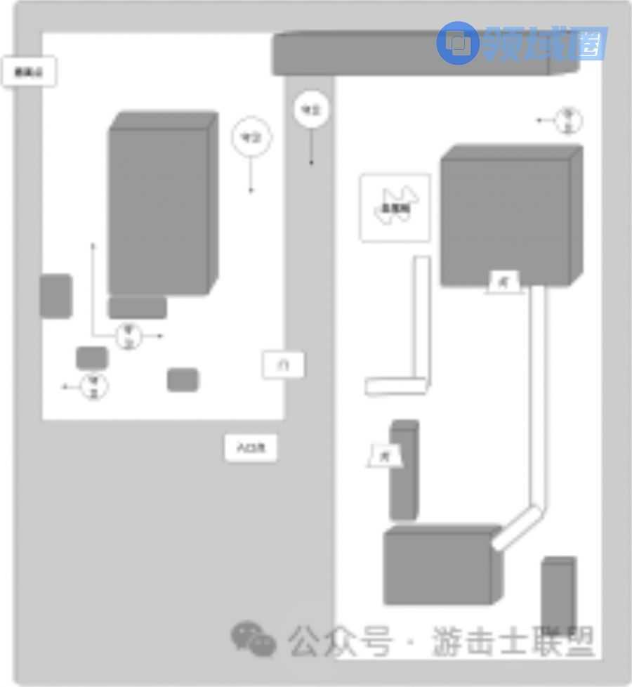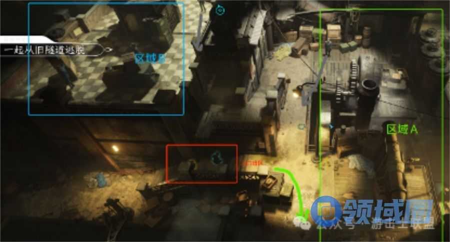 红色区域是入口点,设计成了一个暗区,整个关卡被分为了蓝色的区域和绿色的区域,逃脱点在蓝色区域部分,两个士兵把守要道,逼迫玩家往区域A走(没有士兵把守就直接过关了)。图中的绿色部分便是玩家需要走的路线。