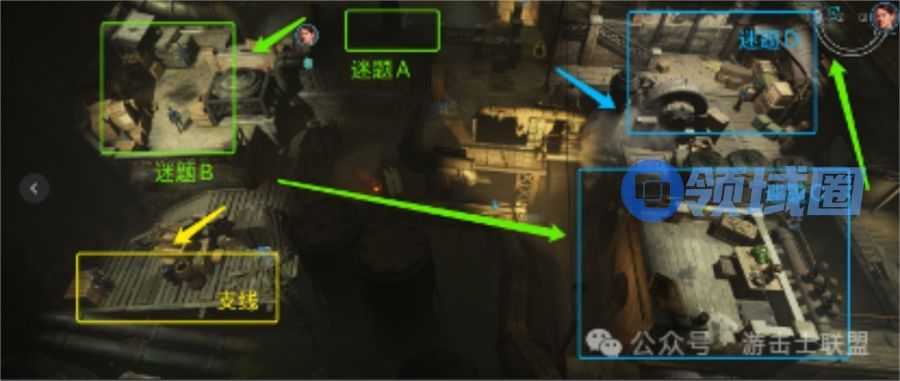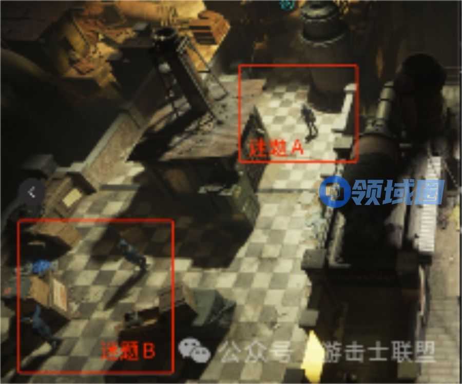 区域A的挑战都是合作挑战设计,和前面章节的的设计方式类似,玩家需要合作解决迷题A部分,让两个人进入区域,区域A设计的有个问题是迷题B没有对玩家造成任何挑战,巡逻的范围过大导致玩家可以轻易的绕开。