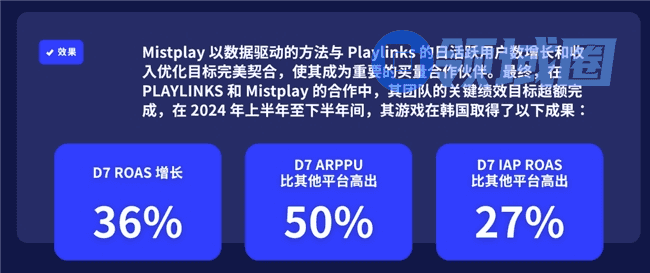 此外还有像韩国Playlinks旗下的知名休闲游戏《AniPANG》系列:在韩国市场使用IAP tROAS 广告产品后,2024年游戏实现了7天ROAS增长36%,7天ARPPU较其他平台高出50%,7天IAP ROAS较其他平台高出27%的好成绩,达成持续获取高留存付费用户的目标。这体现了Mistplay流量池的另一核心优势:不仅能吸引用户,还能筛选出高付费意愿的核心玩家。