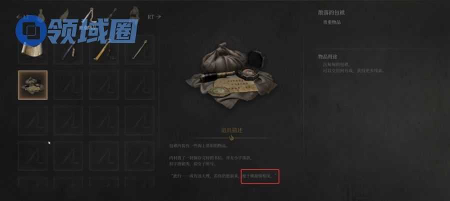 5.道具说明引导;在玩家舔图的过程之中,时常会获取的一些“贵重物品”,主要是一些钥匙、书信、包裹等任务道具,这些道具大多与部分主支线的剧情有所关联,当玩家错过相关剧情的时候,文件的说明也起到指引玩家找到错过内容与区域的作用,例如佛源镇就有大量的任务道具掉落。