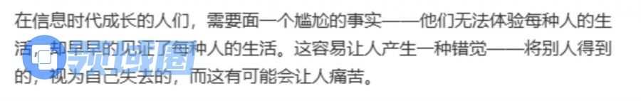 但到了今天,我们观察国内的年轻一代用户时,发现的第一个问题在于:随着宏观经济和人口结构的改变,社会资源和机会的收缩,从上层慢慢传递到了普通家庭体感上后,越来越多的年轻人,其实很难在现实中找到“压抑自己天性和延迟满足”的正反馈循环——例如最经典的,“父母想我好好学习,不要任性,是为了我未来能考上好大学,过上好的生活”。这套逻辑在以前的时代,确实上个好大学,等于能找到让人羡慕的工作,等于未来生活可期。但现在,很多小朋友和年轻人,其实从自己父母身上就已经看到了这个逻辑是不成立的了。所以这套传统的,基于延迟满足构建的正反馈循环自身受到了巨大的挑战与质疑。