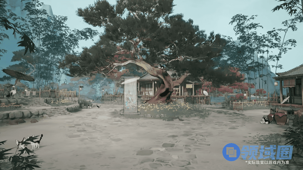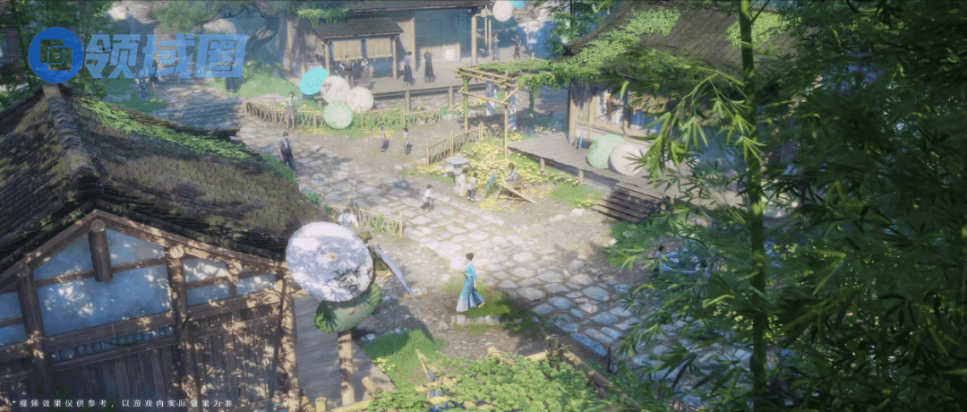 前瞻PV中便曝光了多幅情绪相异的中式幻想场景画。首先是寂寥感。丹青屿被深山和云雾环绕,瞭望台的树下路边,有江南油纸伞点缀其中。而步入村民居住的墨缘乡,则有苍松绿竹迎接来客,让人仿佛走进江南田园——飞檐翘角的传统戏台、殷实古朴的民居和让人感受到一丝烟火气。清冷与热闹之间,营造出属于中国山水画的呼吸感。