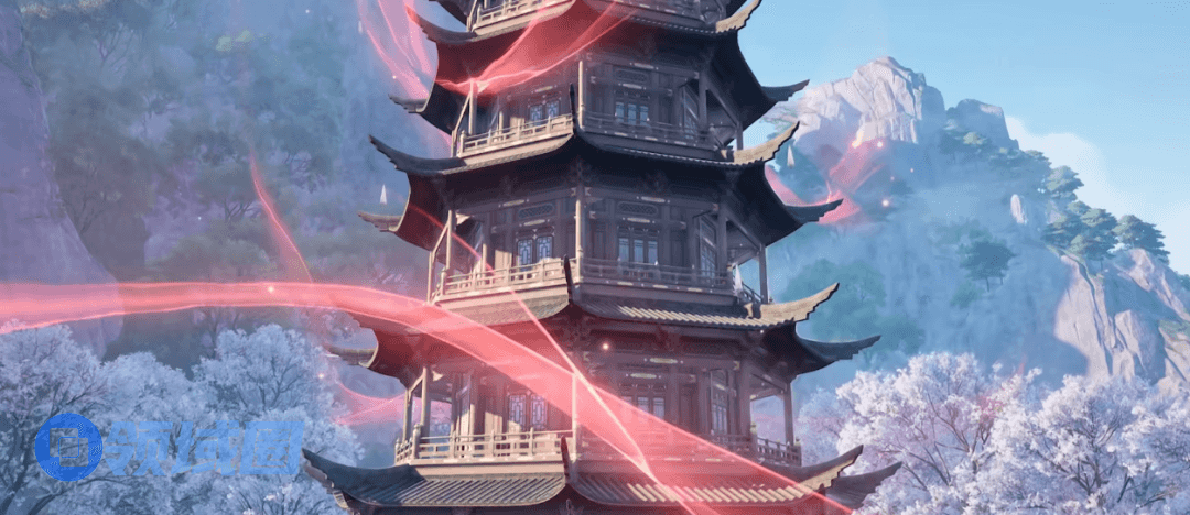 除此之外,还有很多场景让人很好奇:遗世独立的栖龙峰,如白龙卧悬,枫树缠绕其间;山间吊脚楼故居,建在山脚瀑布旁,曲径通幽。就连画中世界的奇想星、露珠和怪物,也染上了丹青效果。