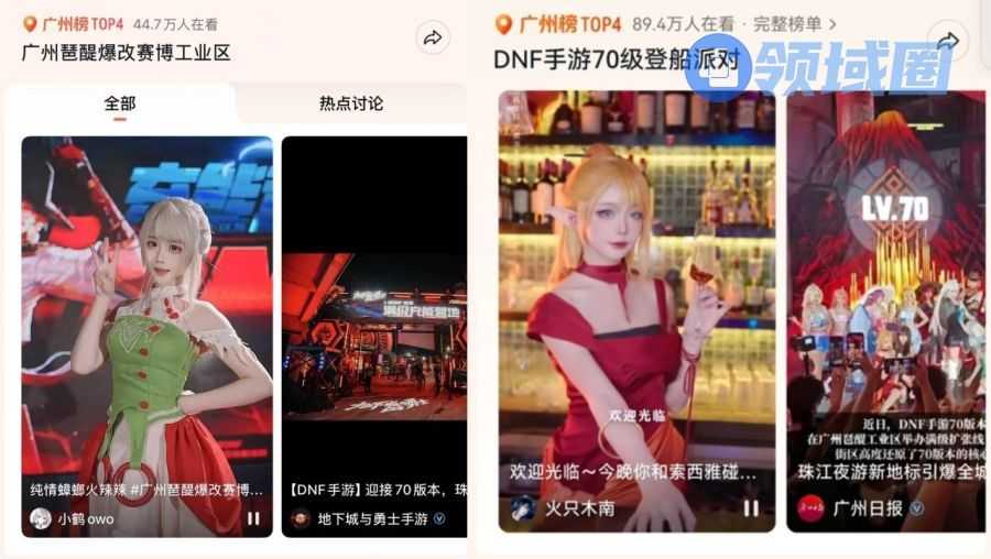 在地标之上打造限时新地标,则是进一步拉近了DNF手游与广州的距离,广州塔、海心沙、猎德大桥等标志性建筑的集体充能仪式,吸引的不仅是DNF玩家的注意力,同时也成为了全城热议的焦点,在抖音平台上,“广州琶醍爆改赛博工业区”、“DNF手游70级登船派对”相继登上抖音本地热榜,刷屏广州人的抖音圈。