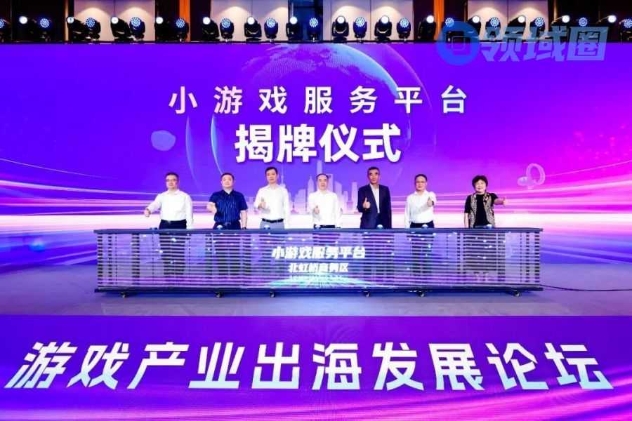上海市委宣传部副部长、市国资委副主任黄斌兵,中国音像与数字出版协会第一副理事长、游戏工委主任委员张毅君,上海虹桥国际中央商务区管理委员会党组成员、副主任杨旭波,嘉定区商务委主任陈烨,嘉定区北虹桥商务区管理委员会办公室常务副主任范意萍,嘉定区江桥镇党委书记甘勇康,嘉定区江桥镇党委副书记、镇长方键共同为小游戏服务平台揭牌。