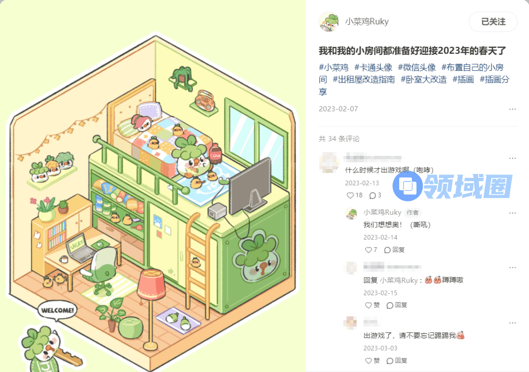 2021年,小顾注册了“小菜鸡Ruky”账号,他设计的绿色“小菜鸡”形象随后在小红书悄然走红。原本团队只想打造玩具IP,却因账号流量表现亮眼,顺势开发了《菜鸡梦想家》这款装修主题游戏。