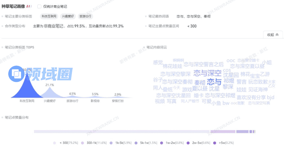 实际上,由于小红书极高的女性用户占比,女性相关游戏即便不做投放,讨论热度依旧不减。新红数据显示,《恋与深空》虽然在商业投放金额排到第二,但非商业笔记互动量占比高达99.5%。