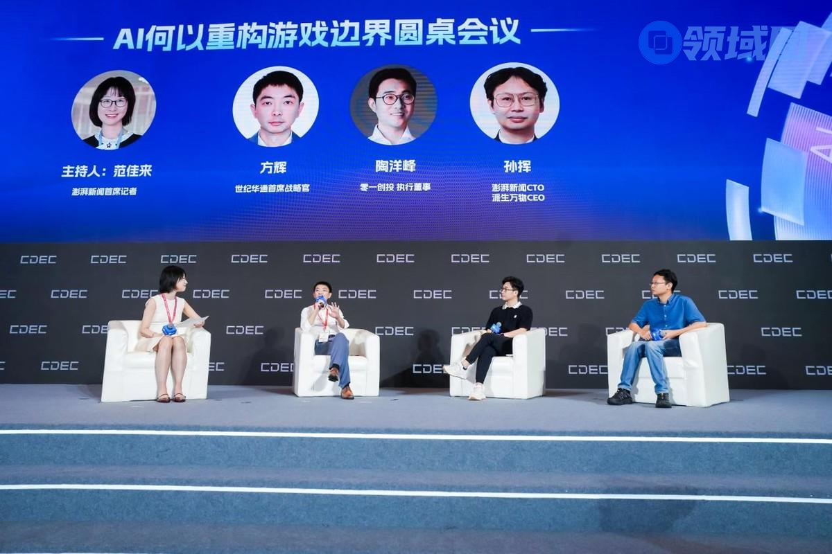 在随后的圆桌论坛环节,澎湃新闻首席记者范佳来与世纪华通首席战略官方辉、零一创投执行董事陶洋峰和澎湃新闻CTO、派生万物CEO孙挥,围绕“AI何以重构游戏边界”展开了讨论。