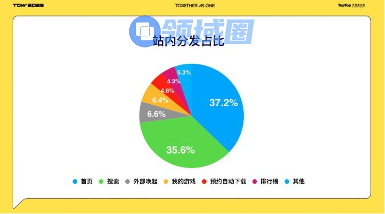 广告分发只占我们流量的一小部分,即便首页 20% 的曝光占比看起来不低,但首页推荐在 TapTap 全站所有分发中的占比也并非那么高。因为从站内整体的流量结构来看,首页推荐的流量仅占不到 40%,而高达 35% 的用户通过「搜索」来寻找游戏。我们为此感到自豪,因为这代表了大量玩家已将 TapTap 视为官方、可靠的游戏下载渠道。当他们知道一款游戏后,会主动打开 TapTap 进行搜索和下载。