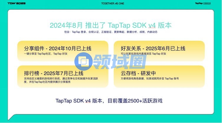 接下来谈谈 TapTap 的 SDK. 我们清醒地认识到,过去 TapTap SDK 的历次版本更新,因兼容性和规划问题给开发者带来了许多困扰。在去年的开发者沙龙上,我们承诺将放低预期,对标 Steam SDK,回归并完善基础功能。经过一年的努力,我们相信 TapTap SDK V4 版本将为开发者提供更稳定、有效的基础功能支持,包括即将上线的云存档功能,它能为许多单机游戏提供接近联网游戏的存档体验。