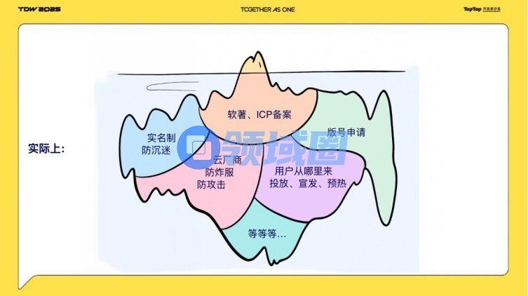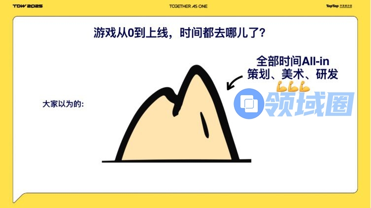 我前两天在网上看到了一个梗图,是说一个游戏从零到上线,时间都去哪儿了,大家梦想做一个游戏的时候,全部时间 All-in 策划、美术、研发。其实冰山下还有无数的深坑,有无数的问题要解决、克服,并不能只专注于游戏研发本身,而不得去做很多自己不擅长,也不感兴趣的领域。这就是我们为什么要去做小游戏,为什么要去做 SDK,为什么做商业化的尝试,所有都是围绕这个点,希望将来有一天大家在 Tap 上做游戏,尽量少考虑其他东西,只考虑我想做一个怎样好玩的游戏,只要这个游戏做出来了,玩家玩到了,就能够有正向的反馈,就能够去做更好的产品,这是我们的愿景。
