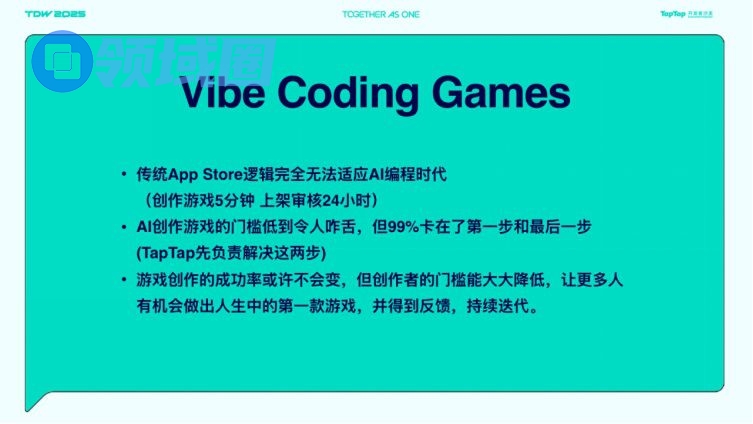 他认为,AI 编程已将游戏创作的门槛降至令人咋舌的低点,但复杂的开发环境配置与传统应用商店漫长的分发流程,成为了阻碍创意的最大瓶颈。TapTap 将通过大力发展小游戏平台等方式,将「创意产生-游戏上线-算法分发-玩家反馈」的整个流程极致提速,拥抱 vibe coding 时代,让更多有创意的内容创作者,有机会做出自己的第一款游戏。