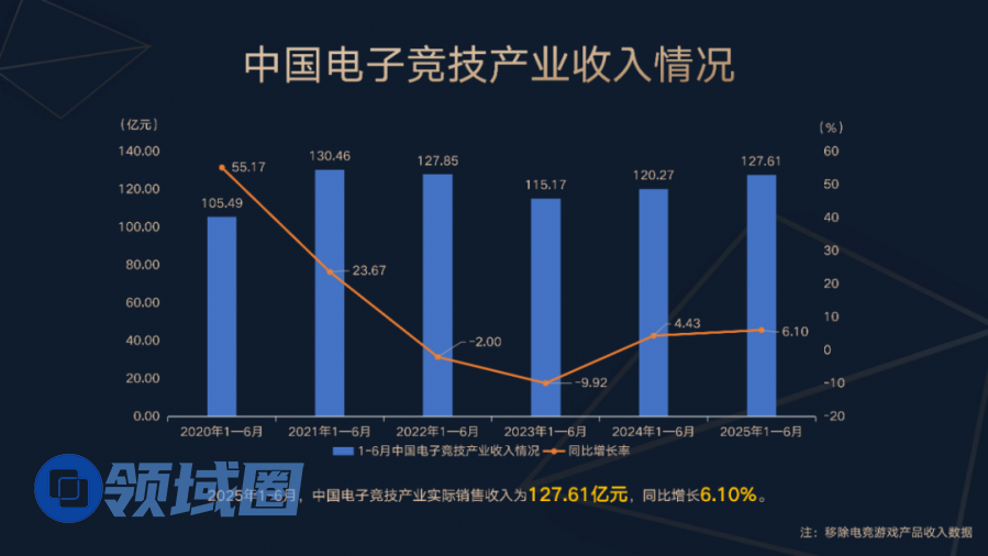 2025年1-6月,中国电子竞技产业收入127.61亿元,同比增长6.10%。