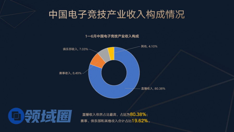 截至今年6月,电竞产业的收入中,直播收入依然占比最高,为80.38%。赛事、俱乐部和其他收入合计占比19.62%,收入结构相对稳定。