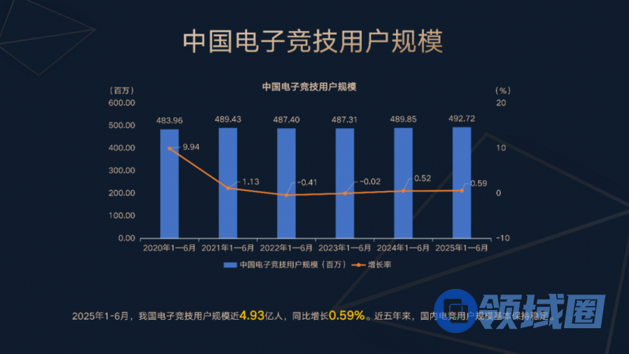 截至今年6月,中国电子竞技用户规模近4.93亿人,呈微弱增长,规模基数较为稳定。