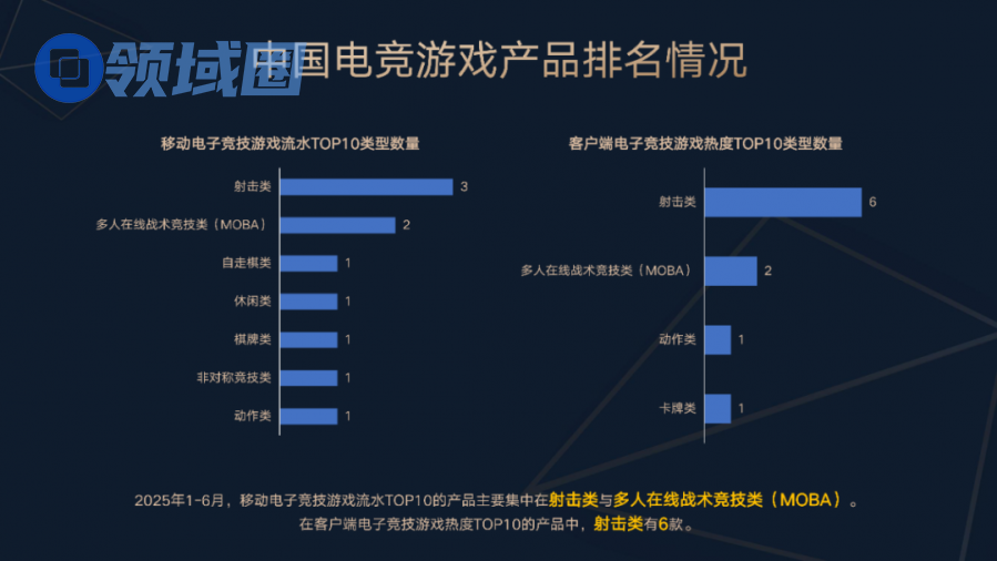 1-6月,流水排名前10的移动电竞游戏产品依次为射击类、多人在线战术竞技类、自走棋类、休闲类、棋牌类、非对称竞技类和动作类。热度排名前10的客户端产品中,有6款为射击类。