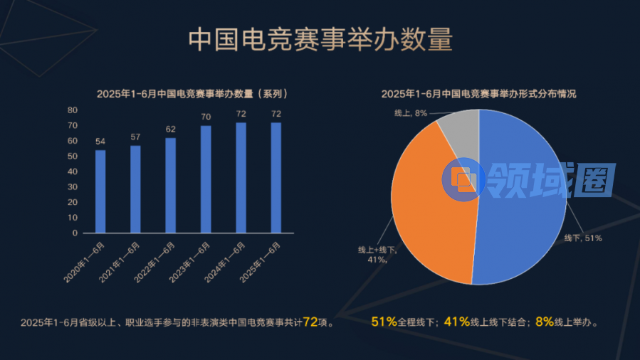 1-6月,参赛范围在省级以上,并由职业选手参与的非表演类电子竞技赛事,共举办72项,与去年同期持平。其中51%为全程线下举办,41%为线上线下结合举办,8%为线上举办。线上线下结合办赛同比明显增加。