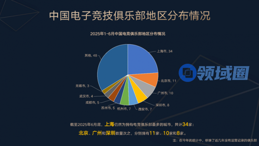 截至今年6月,上海仍然为拥有电竞俱乐部最多的城市,共计34家。北京、广州和深圳数量次之,分别拥有11家、10家和8家。