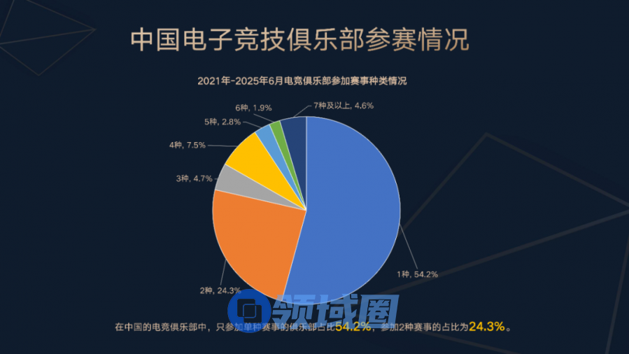 在中国电竞俱乐部中,只参加单种赛事的占比为54.2%;参加2种赛事的占比为24.3%;参加3种赛事的占比为4.7%;参加3种以上赛事的占比为16.8%。