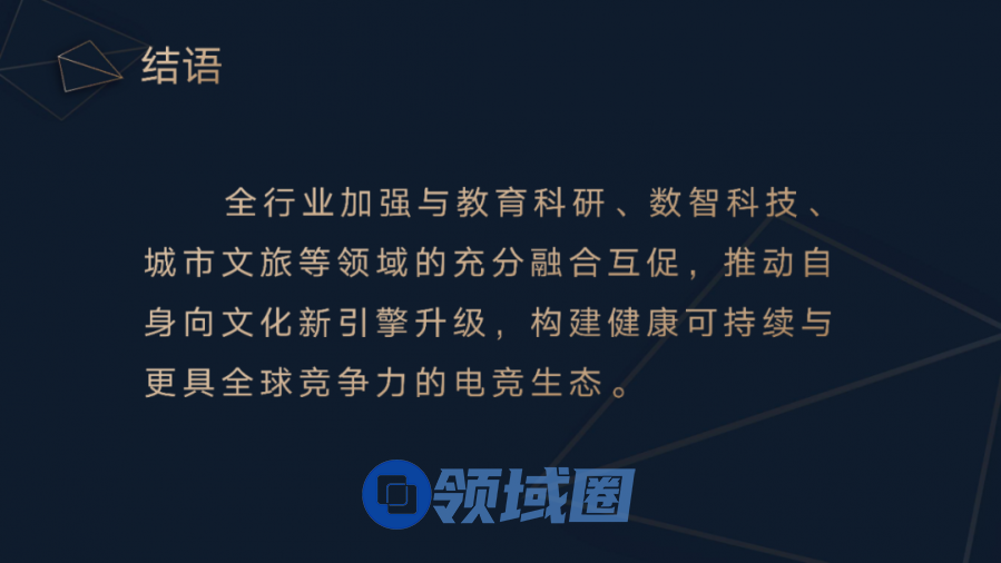 2025年上半年,中国电竞产业在市场收入、新品面世与赛事出海等方面均呈现增长趋势,已形成涵盖产品、赛事、直播平台、俱乐部和跨行业联动较为的完整产业链,正在规范化、主流化、国际化方向上稳步前行。未来,我国电竞产业应抓住政策利好和全民关注的有利机遇,不断推出高精尖电竞产品,打造健康精彩电竞赛事,积极投身国际赛场,在交流互动中强化自身影响力。践行这一愿景,需要全行业加强与教育科研、数智科技、城市文旅等领域更加充分的融合互促,推动自身向文化新引擎升级,从而构建健康可持续与更具全球竞争力的电竞生态。以上为报告摘要发布的全部内容,谢谢大家!