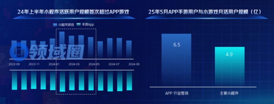 而小游戏大盘以超 30%复合增长率快速扩容,在移动游戏大盘中的占比持续攀升,成为驱动行业增长的核心引擎。2024年上半年小游戏月活首超 APP 手游,2025年小游戏月活用户规模近5亿。