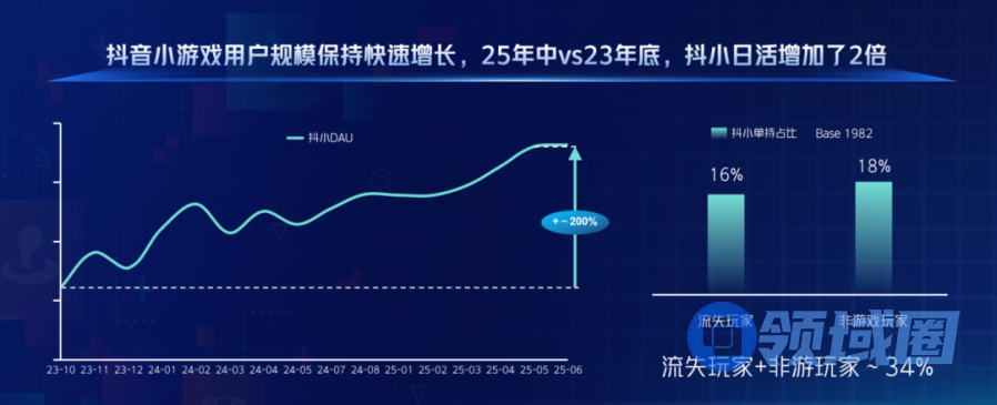 具体在抖音小游戏方面,截至25年中,抖小日活跃用户规模相较于23年底实现翻了两倍,吸引了大量流失玩家及非游戏玩家,占总玩家规模约34%。
