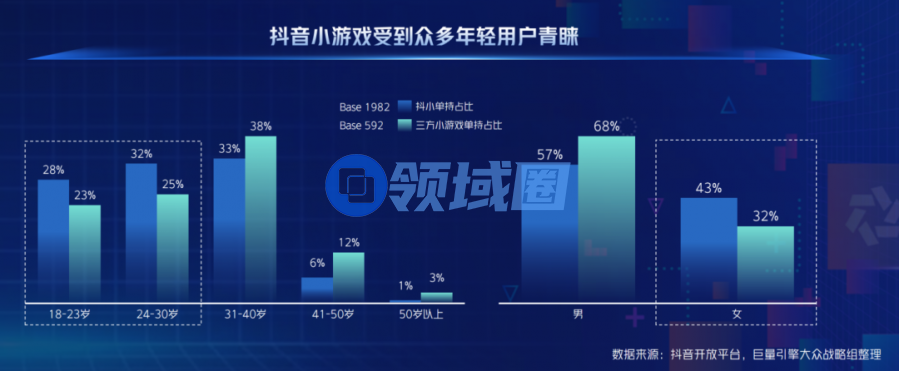具体分端口来看,抖音小游戏男女更均衡(57%:43%,女玩家占比高于三方小游戏的32%);同时抖音小游戏用户更年轻(30岁以下用户占60%,高于三方小游戏的48%)。
