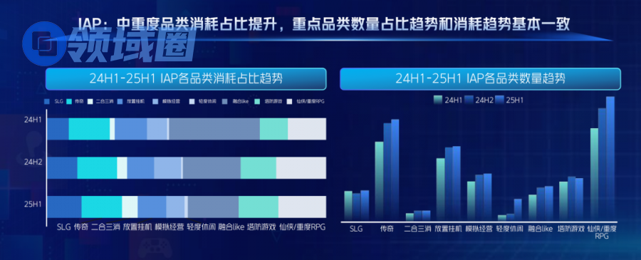 在IAP方面,大盘总体来看,25H1 IAP小游戏:中重度玩法消耗占比提升,头部效应强化。SLG、仙侠等 中重度 IAP 品类消耗占比跃居前列 ,验证用户付费意愿与时长承载力。题材从泛娱乐向二次元、国风、科幻等垂类深化,依托IP改编与文化融合打造差异化竞争力。