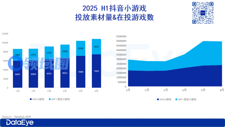 DataEye-ADX数据也印证了这一点,2025上半年抖音小游戏在投游戏数持续增长,6月总在投游戏数超过1.08万款,环比1月提升约25%。IAP+混变在投游戏数在6月突破3400款,越来越多中重度小游戏布局抖音小游戏赛道,占比大盘升至31%。