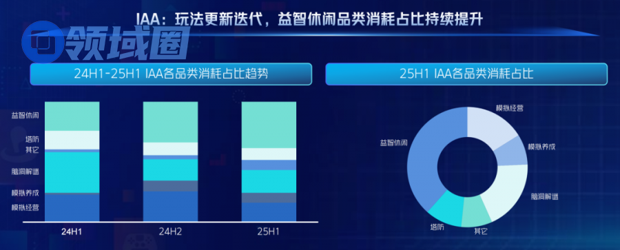 在IAA方面,大盘总体来看,25H1 IAA中度休闲:占比提升,多题材涌现。益智休闲、模拟经营等 中度 IAA 品类消耗占比持续走高 ,解谜 + 剧情、消除 + 养成等复合玩法频出。纯广告变现向“IAA+IAP”混合模式迁移,通过分层付费设计兼顾泛用户与核心玩家价值挖掘。
