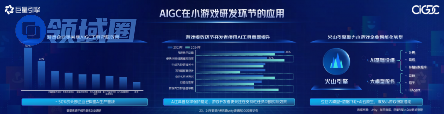 巨量引擎也在此次大会期间展示了火山引擎AI产品对于小游戏端口的助力,据介绍,在产品立项期火山引擎可以通过AI生成虚拟玩家、游戏资源以及聊天对话等方式来对产品内容进行细致打磨。