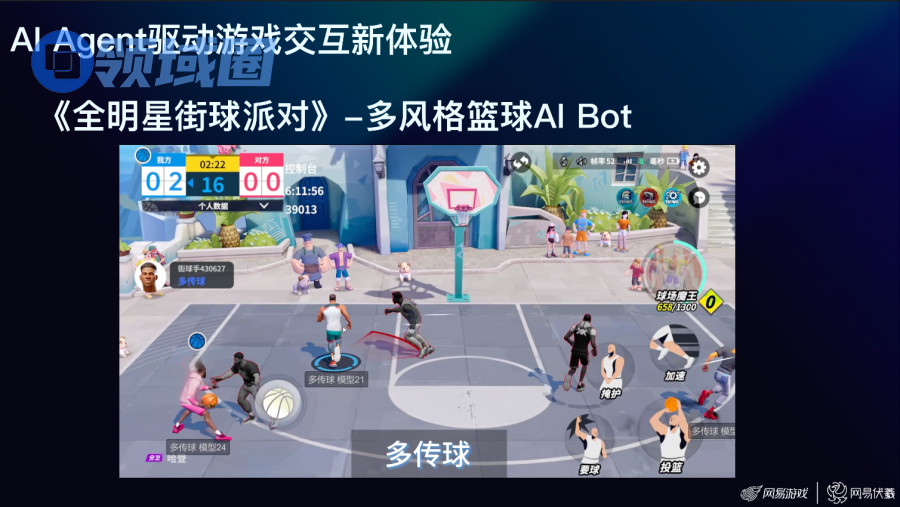 《全明星街球派对》中,AI Agent则化身“战术大脑”,通过强化学习技术训练出“单打突破型”“团队协作型”等不同风格的篮球AI Bot,它们能实时响应玩家“多传球”“压时间”“投三分”等语音指令,并调整战术配合。可以说,以前玩家是和“程序”打球,现在是和“队友”并肩作战。