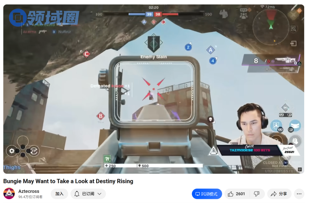 百万粉的头部主播Aztecross在深入游玩了《命运群星》的测试后,专门剪了一个视频,把《命运群星》里独占的新内容剪成一个快20分钟的长视频,专门点名Bungie“来学习”!