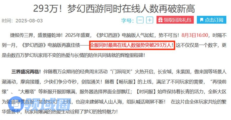 293万同时在线人数的新纪录远不是《梦幻西游》电脑版的天花板。也许不久的将来,我们就能看到突破300万同时在线人数的全新纪录,因为——纪录本来就是用来被打破的。为了铭记这个历史成绩,《梦幻西游》畅玩服首台数字服“2025”在8月8日温情开启。