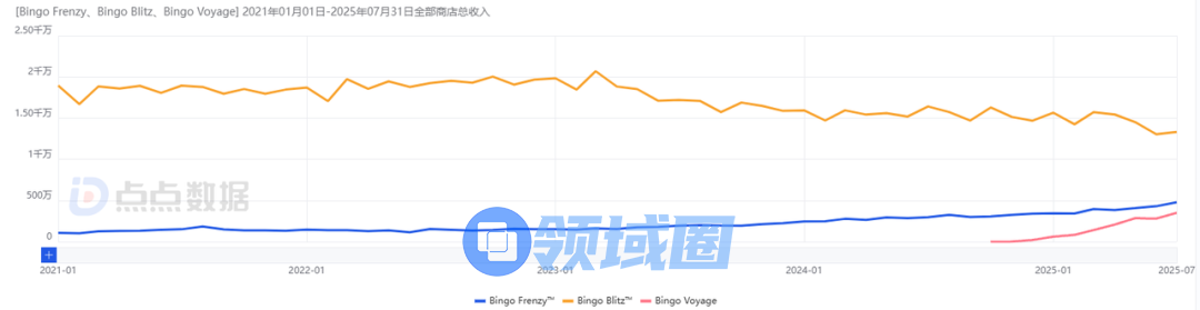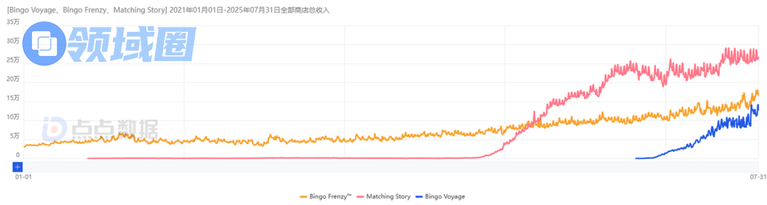 凭借热门前作积累的市场经验和精准的内容优化,《Bingo Voyage》在2024年10月上线后,收入一路爆发式增长。月收入从2024年12月的21.13万美元,飙升至2025年7月的350.9万美元,仅用8个月就实现了16倍的惊人增幅。