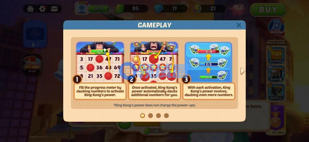 在传统Bingo玩法之外,该游戏还增加了一些特殊关卡,提升了游戏内容的丰富度。比如在“金刚关卡”中,玩家每次盖章都能填充金刚的的力量,当金刚力量进度条拉满,金刚就会直接在其他位置上进行盖章,提高完成Bingo的概率和效率。