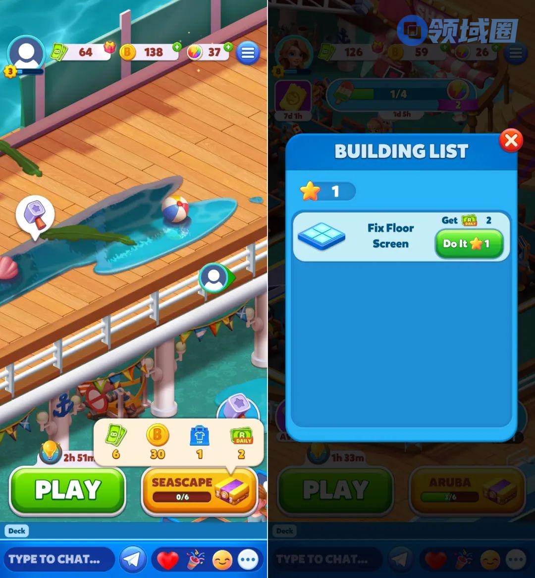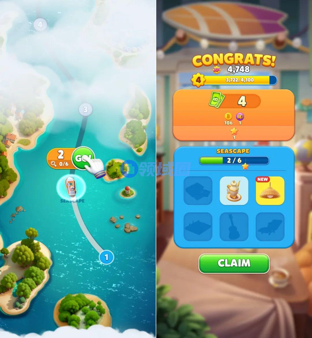 同时还在关卡之外,加入了消除赛道常用的家装改造等外围玩法,遭遇风暴后,玩家可以使用对局积累的星星资源对游轮进行修复,获得额外的游戏券奖励。