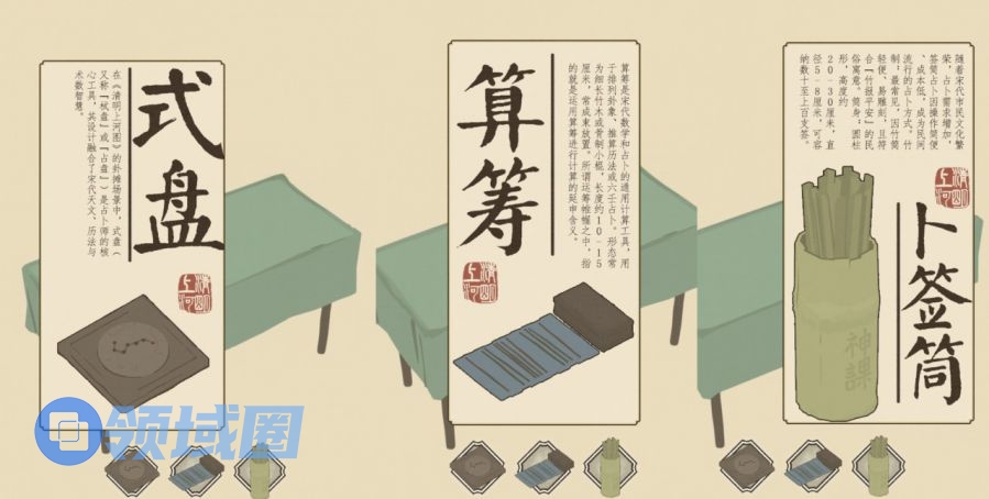 当然后续也不会有模拟经营的玩法了,这对于目前的我来说太过复杂了,很有可能费力不讨好。目前还是希望玩法尽量简单直接。不过我一定会针对不同主题的关卡加入一些创意小游戏来丰富游戏体验。比如示例中清明上河图的卦摊场景,涉及到的卜卦器具可以互动,进入卜卦小游戏,让玩家可以真真正正的算上一卦,和宋朝的算命先生来一场赛博对话。