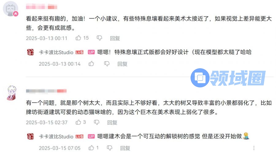 当然,在不断发开发日志的过程中,我也收到了很多留言。只要不是恶意的留言我觉得都很有用!有很多留言是针对游戏玩法的建议,比如建造方式,世界观设定,和风水的结合等等。只要不是对我来说太难实现的我都会认真的考虑。