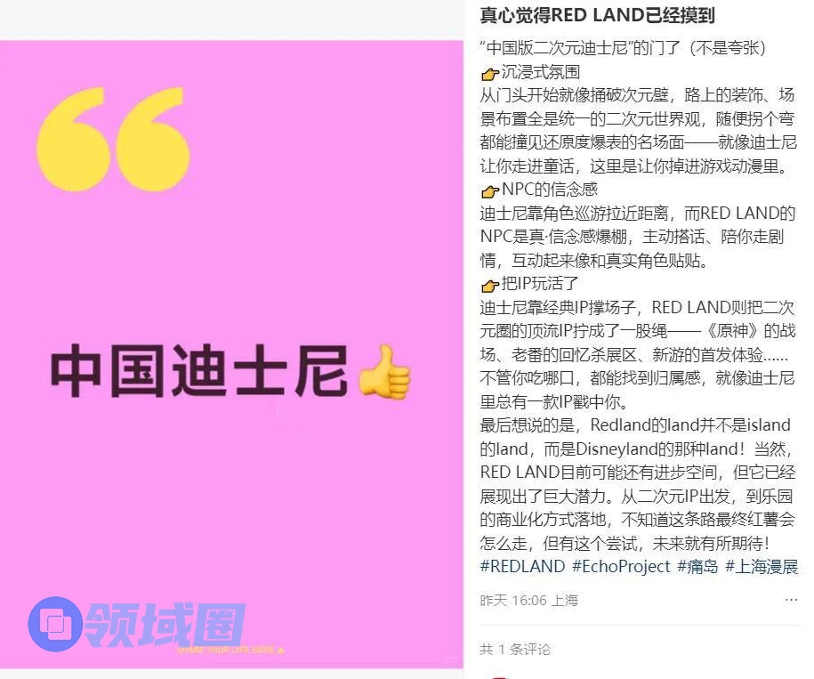 复兴岛因这场活动重焕生机,二次元文化也在这样的线下场景中打破次元壁,被更多人理解与接受。或许,这就是 RED LAND 最珍贵的地方 —— 它不仅打造了一座乐园,更搭建了一座桥梁,让不同的世界在此相遇、交融,共同书写出新的故事。而这样的故事,未来或许会在更多地方上演。